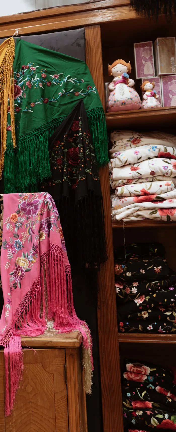 Descubre en nuestra tienda una extensa colección de mantones nuevos y antiguos, con ejemplares únicos de distintas épocas, modelos, tamaños y colores. Te invitamos a visitarnos en Pasaje Ripalda, 18, Valencia, donde estaremos encantados de atenderte y compartir contigo la pasión por esta prenda única.