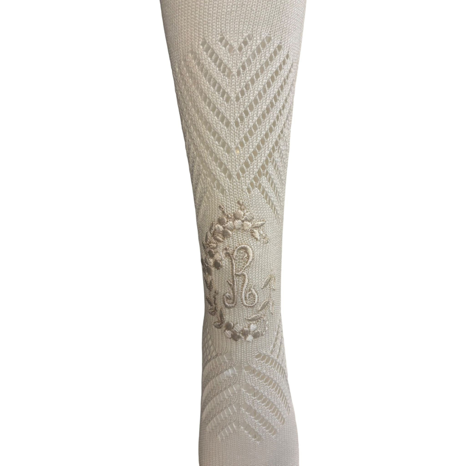 Las medias caladas con inicial "R" bordada son el accesorio perfecto para la indumentaria tradicional valenciana. Con un diseño refinado en color marfil, presentan un elegante calado con motivos florales y un delicado bordado en tonos crema aportando distinción y autenticidad.