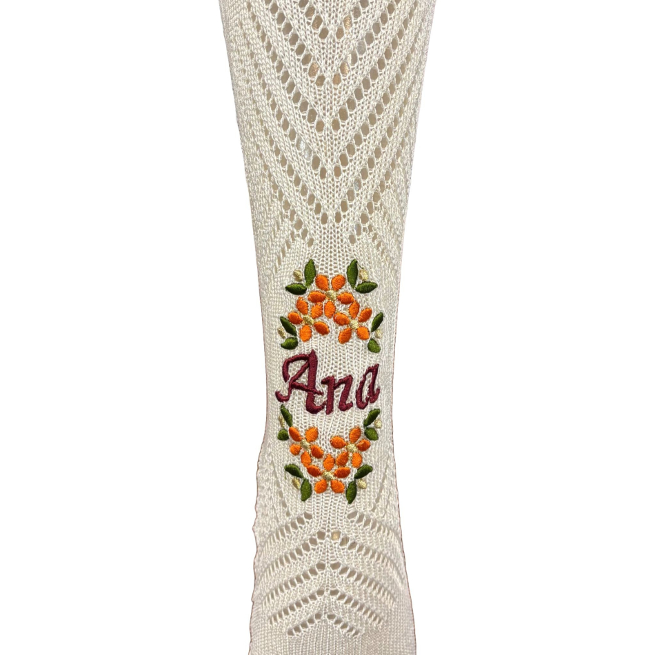Las medias "Ana" bordadas son el complemento ideal para la indumentaria tradicional valenciana. Con un refinado diseño calado con motivos florales y el nombre "Ana" bordado a mano, destacan por su belleza y distinción.