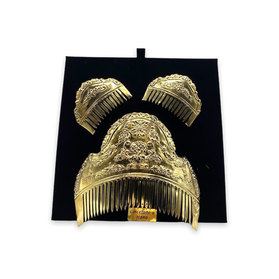Las peinetas fallera 2228 de Artesanía Castillo destacan por su diseño elegante y tradicional, cinceladas a mano con delicados motivos vegetales de flores y volutas. Fabricadas con la máxima precisión artesanal, son el complemento perfecto para el traje regional valenciano, aportando distinción y autenticidad. Este modelo en talla adulta realza el peinado con un estilo sofisticado y fiel a la tradición. Además, cuentan con el certificado de Artesanía de la Comunitat Valenciana, que avala su calidad y origen artesanal.