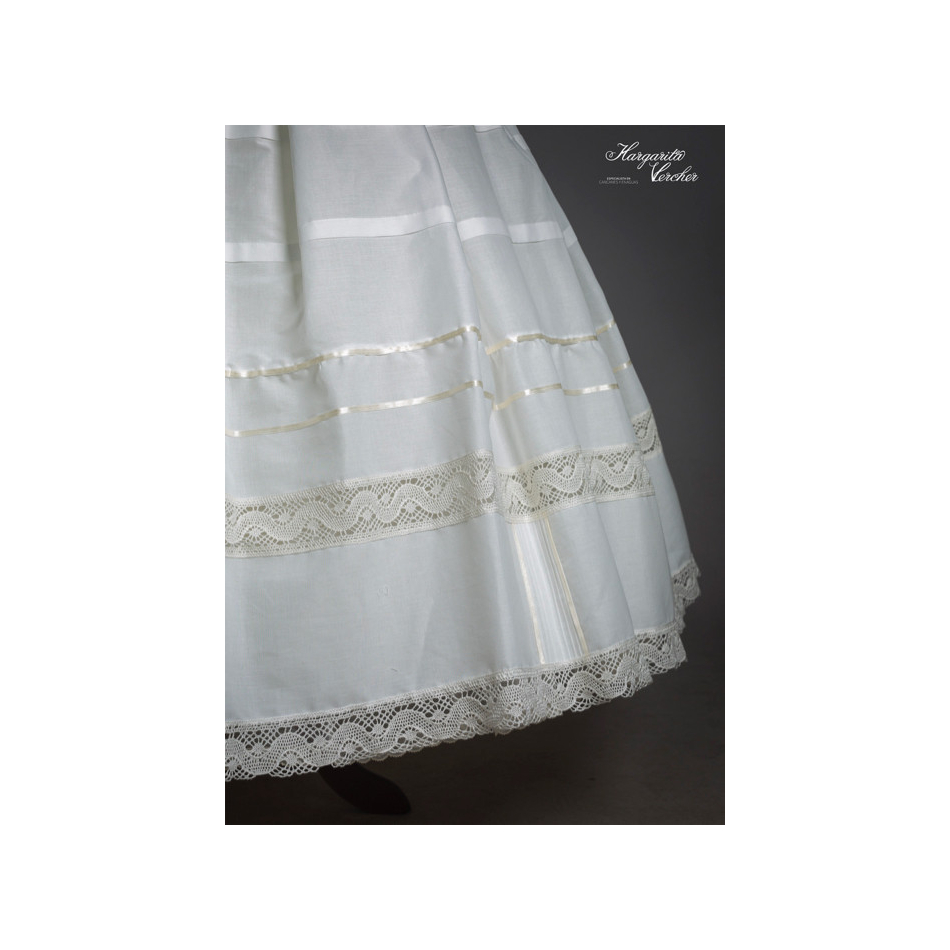 La enagua fallera Rosi de Margarita Vercher es el complemento ideal para tu traje tradicional. Con lorzas y puntillas delicadamente diseñadas y una faltriquera lateral que ofrece funcionalidad y elegancia, esta enagua asegura una base perfecta para tu falda.