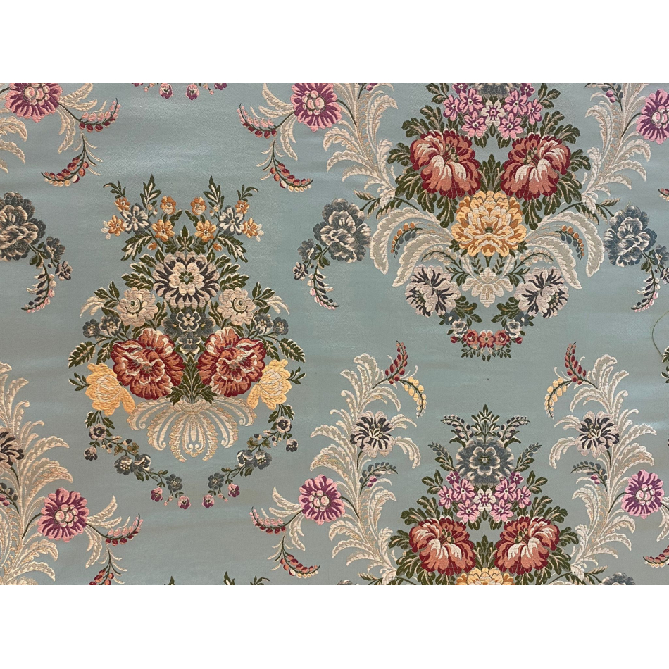 Corte tela fallera Cadaqués fondo cielo de Vives y Marí, con un diseño elegante de composiciones florales y guirnaldas. Ideal para la creación de trajes de fallera y otros usos en indumentaria tradicional.